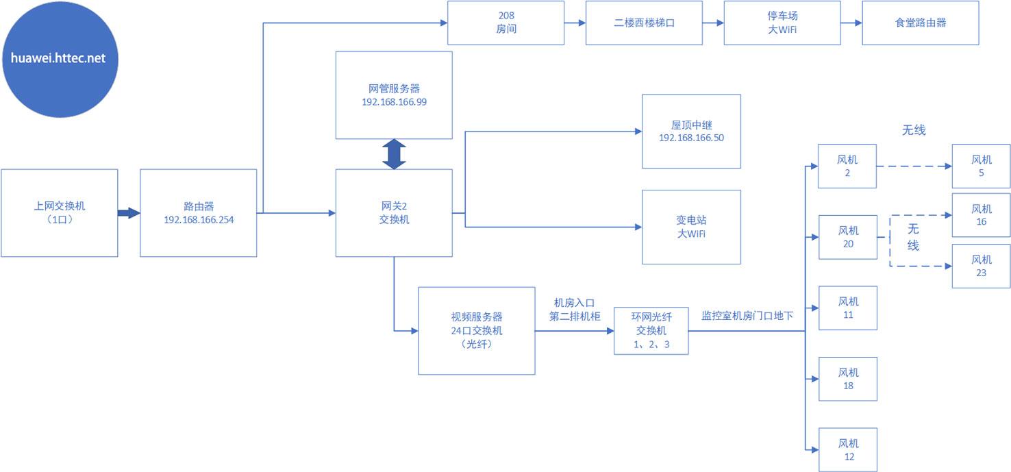 針對地形起伏大的難點,我們通過合理的設(shè)計將設(shè)備定位在地勢相對較高、風(fēng)機(jī)間可視條件較好的幾個中心風(fēng)機(jī)上,結(jié)合風(fēng)機(jī)自身70m的高度完成無線覆蓋。通過8個風(fēng)機(jī)將全場的33個風(fēng)機(jī)包括檢修道路完成無線覆蓋。網(wǎng)絡(luò)拓?fù)淙缦拢?br>