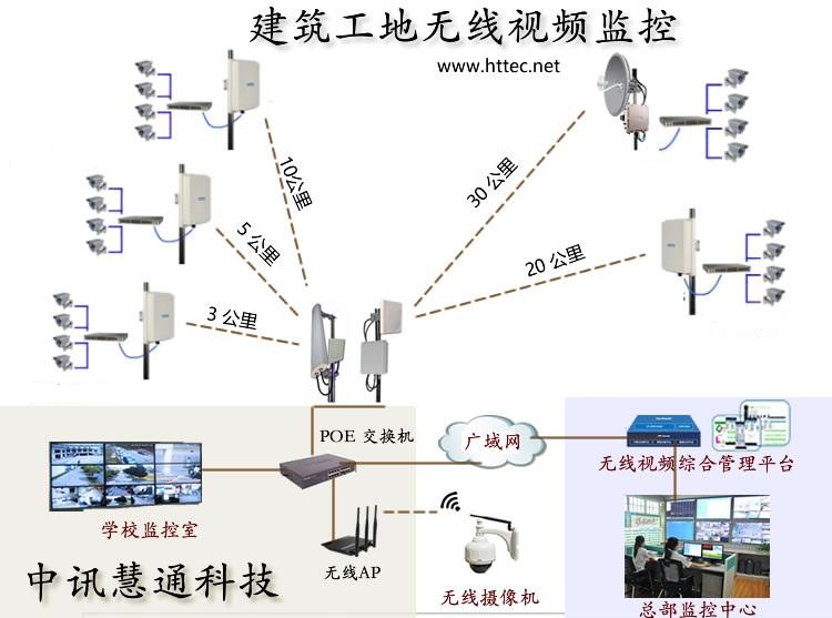 本次方案就采用了WLAN無線監(jiān)控,工地內(nèi)部使用無線網(wǎng)接入,外部使用ADSL或LAN接入互聯(lián)網(wǎng)。