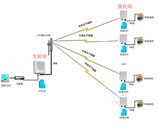 按照要求分別在港口二十個點處分別安裝百萬高清網(wǎng)絡攝像機,每個點獨立用一臺高性能無線網(wǎng)橋作為發(fā)射,前端一共需要二十臺設備來發(fā)射;